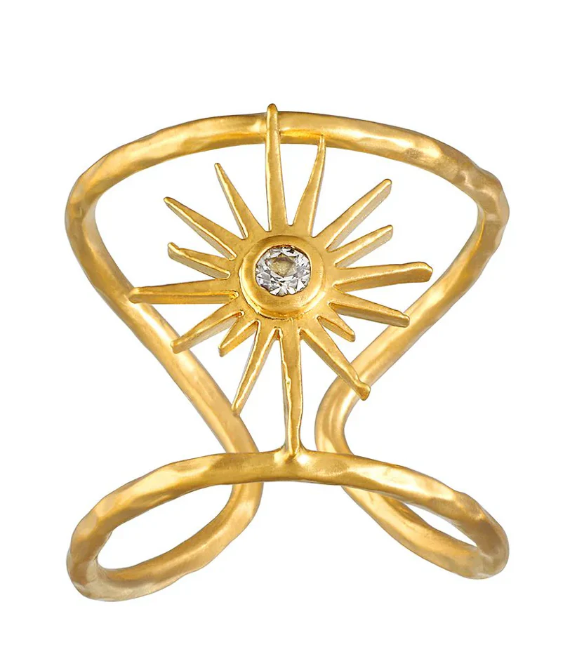 Cette magnifique bague faite à la main plaqué or 18 carat et ajustable avec la symbolique du soleil et / ou l’étoile qui brille serti d’une pierre de topaze blanche.