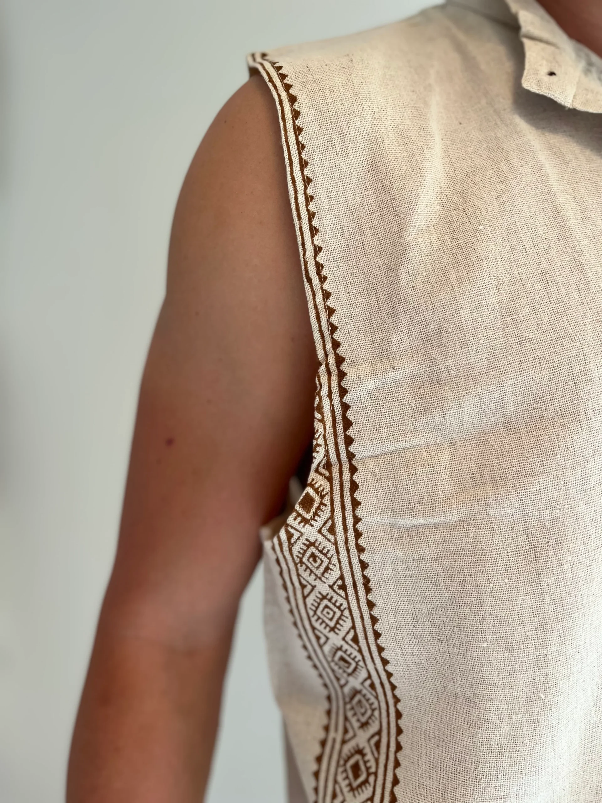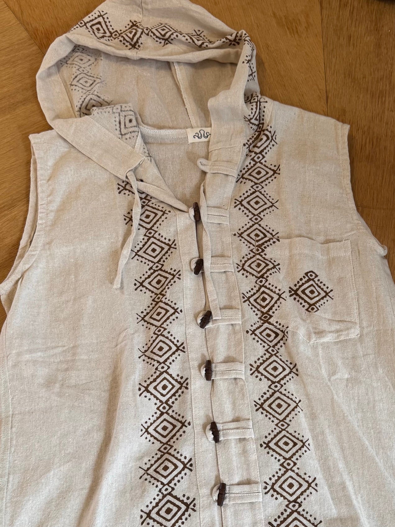 Tunique- chemise pour homme sans manche avec motifs aztèques et petits boutons de fermeture en bois. En coton naturel brut sans coloration tissé effet lin. Taille assez grand.