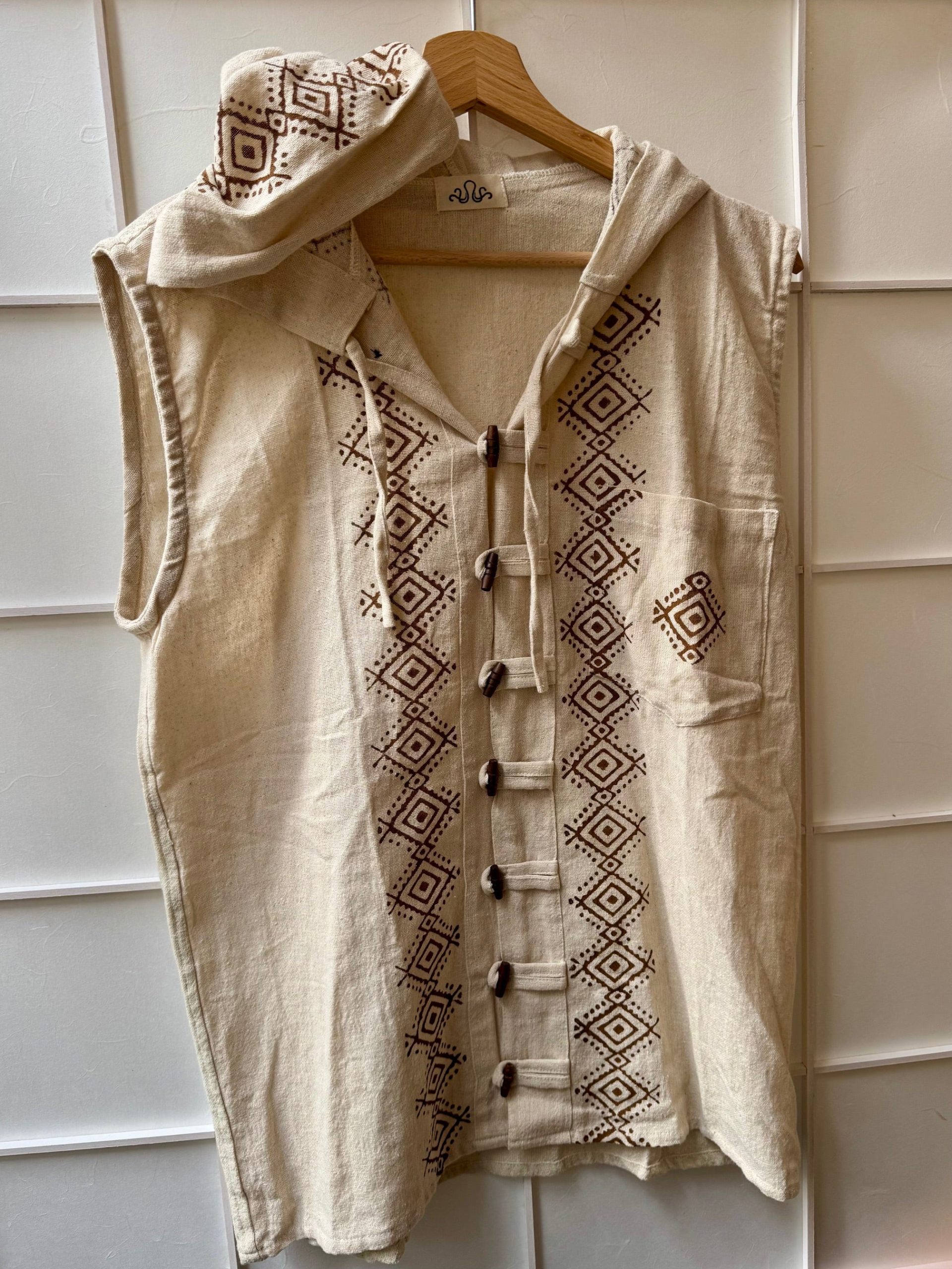 Tunique- chemise pour homme sans manche avec motifs aztèques et petits boutons de fermeture en bois. En coton naturel brut sans coloration tissé effet lin. Taille assez grand. Très cool aussi à porter avec un pantalon en lin ou un jeans comme Street Wear décontracté & estival pour les festivals, la plage, voyage etc.. Matière […]