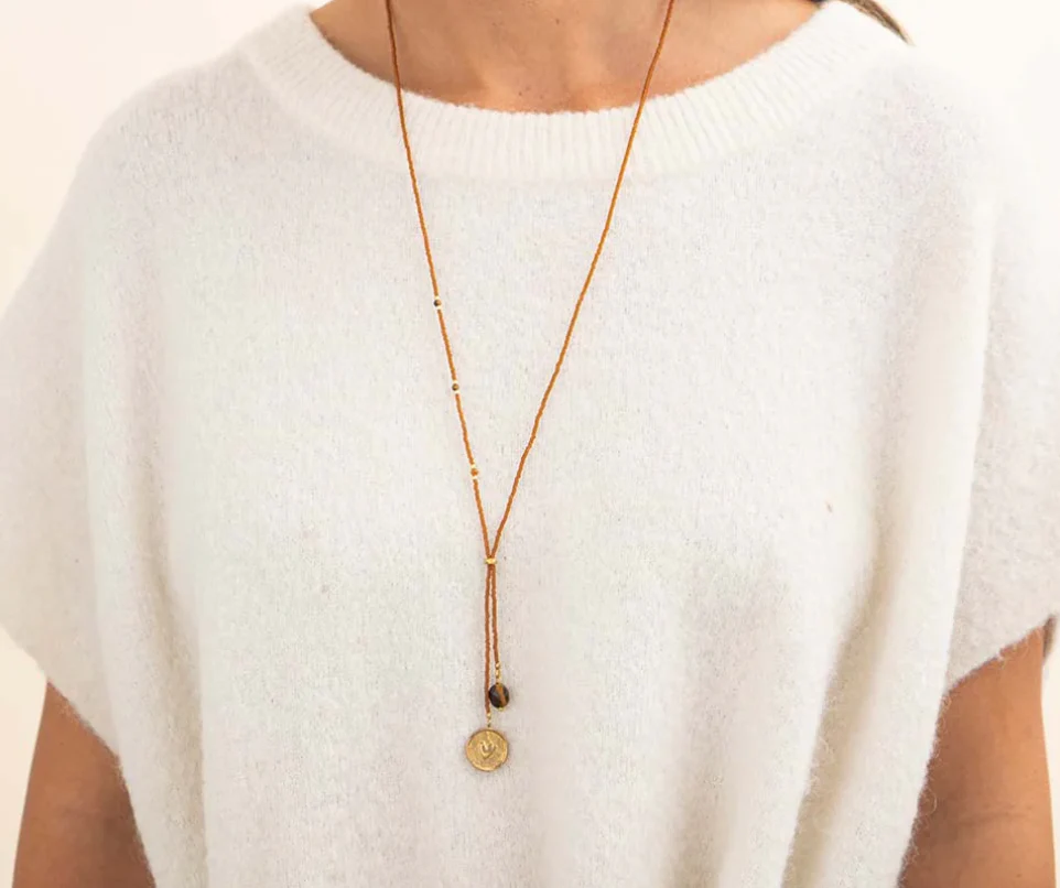 Le collier Purpose doré avec pierre d’oeil de tigre est une belle pièce composée de perles de verre, de laiton plaqué or et de trois petites pierres précieuses de type oeil de tigre. Le collier se divise en deux extrémités. D’un côté, un grand pendentif en oeil de tigre et de l’autre, une pièce de […]